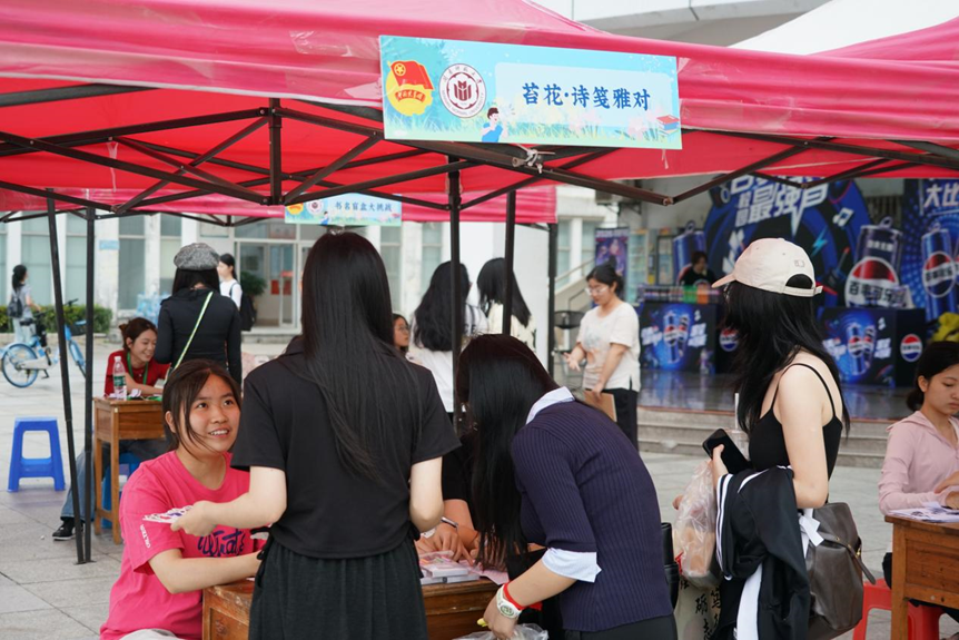 阅读市集现场,达理学生活动中心一楼前广场摇身一变成了书香游乐园。市集摊位前,书名盲盒吊足胃口,文学角色猜猜乐考验脑洞,故事碎片接龙更是笑声连连,还有名著拼图、诗笺雅对、飞花令、金句盲盒……阅读不再只是“看”,而是可以听、可以玩、可以带走的一份惊喜。春风里,书香里,是闽南师大青年最青春的样子。