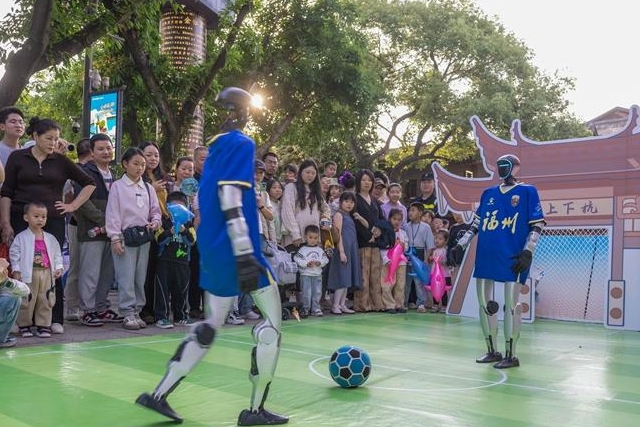 当下,“闽超”热潮席卷全城。活动现场特设数字文旅体验专区,酷炫AI机器人足球表演燃爆全场,灵活的机械身躯随着音乐节奏精准传球、射门,现场掌声雷动;游客在现场也过了一把足球瘾,在数字足球体验区,游客与屏幕中的虚拟守门员展开“人机大战”,激烈的“战况”引得观众惊呼连连。游客还在现场设置的“闽超”观赛第二现场观看精彩赛事直播,氛围感拉满。