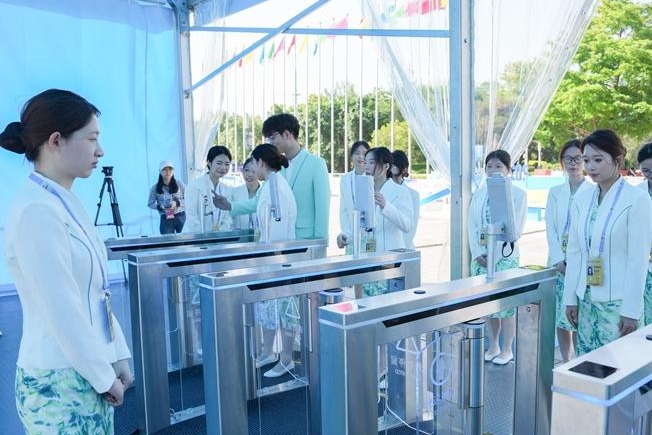 志愿者在检入口开展人脸识别入场演练。记者 包华 摄