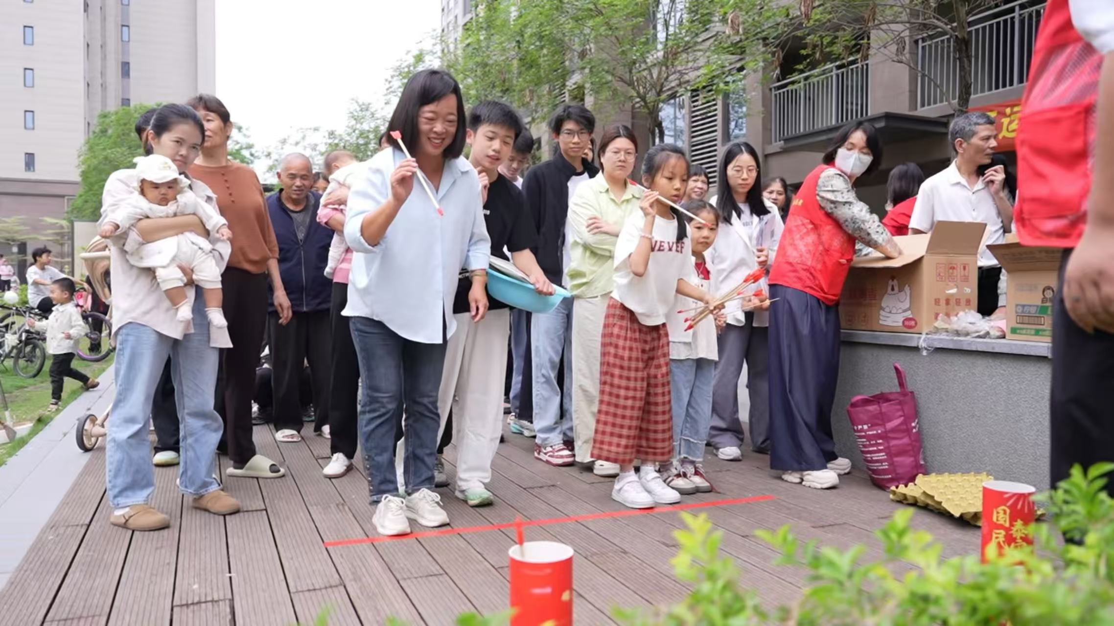 活动现场设置投壶、套圈、两人三足、养生健康跑等趣味互动体验项目,内容丰富、形式多样。古风投壶活动趣味十足,带领大家沉浸式感受传统韵味;经典套圈游戏礼品丰富,深受大人和小朋友喜爱;养生健康跑带领居民在轻松运动中收获健康与快乐;两人三足团体竞赛则考验团队默契,邻里结伴协作,在欢声笑语中拉近彼此距离。