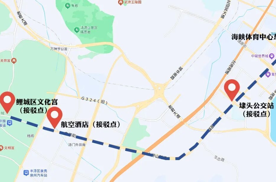散场:海峡体育中心东大门—— 埭头公交站(下客点)——丰泽广场(下客点,过人行天桥步行约500米到达航空酒店)——鲤城区文化宫(下客点)