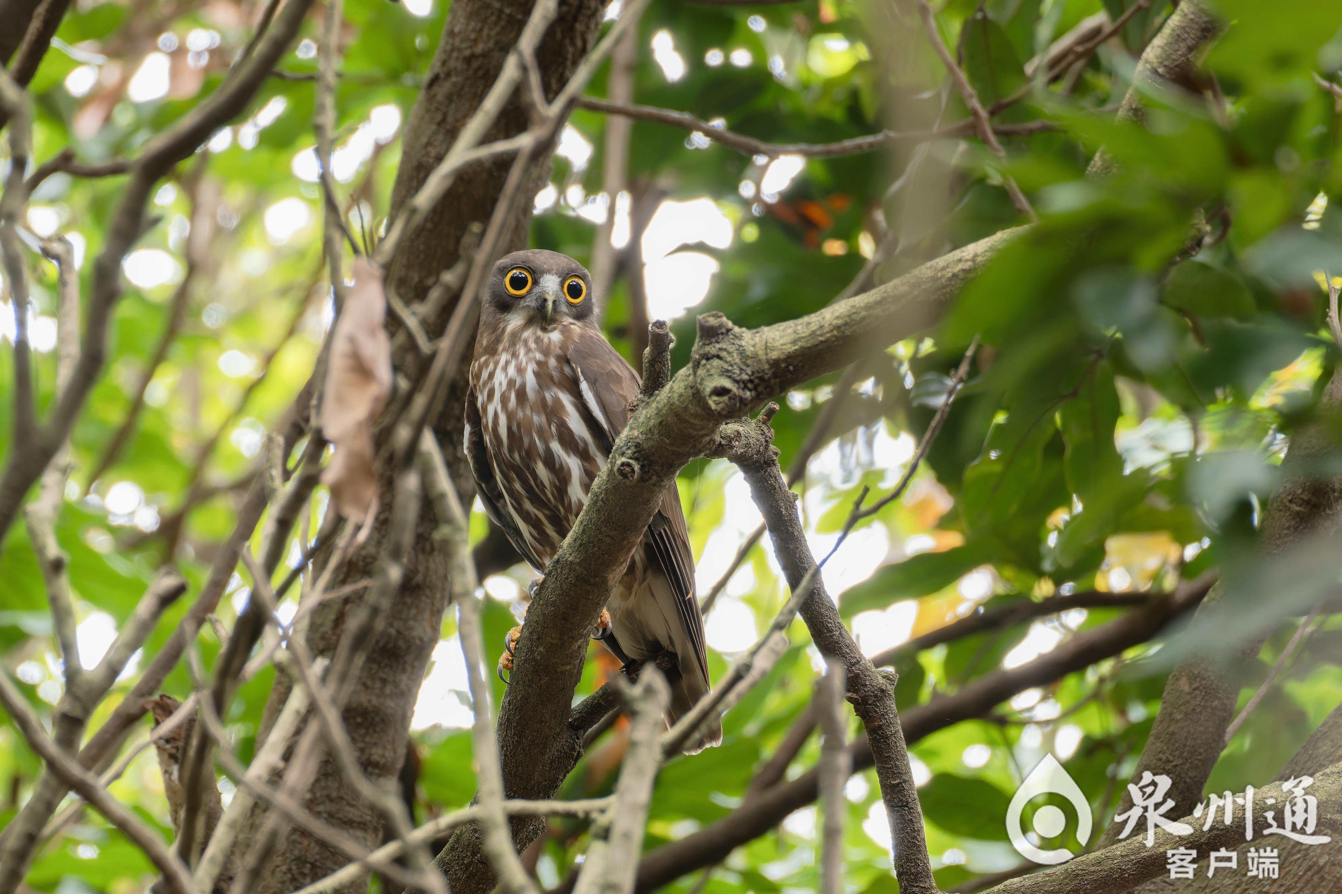镜头中,北鹰鸮体态修长,身披巧克力棕色的羽衣,腹部洁白且缀有红棕色条纹,一双金黄色的眼睛格外引人注目,飞行时身姿似鹰,灵动又矫健。他猜测,这只北鹰鸮大概率是春迁途中路过泉州,短暂停歇觅食。