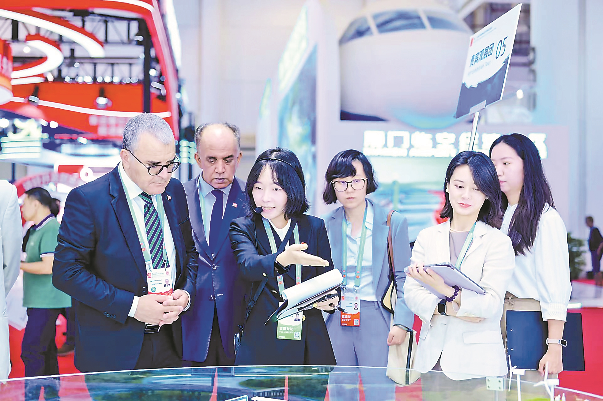 第二十五届投洽会上,“金钥匙”厦门大学志愿者用流利的英文向突尼斯部长团介绍展台内容。(投洽会组委会会务部供图)